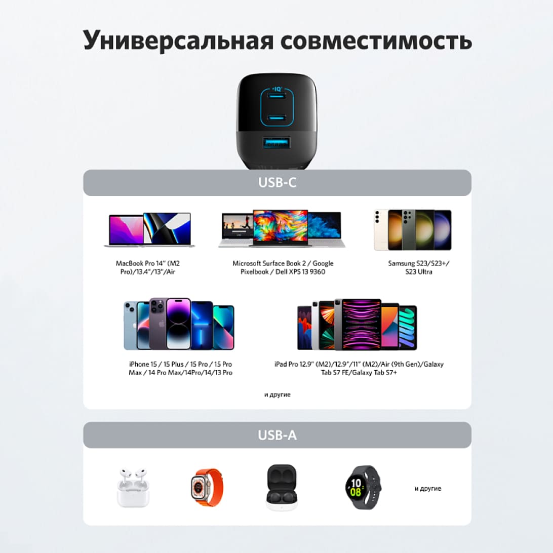 - 3 порта: 2 порта USB-C и 1 порт USB-A позволяют одновременно заряжать несколько устройств.